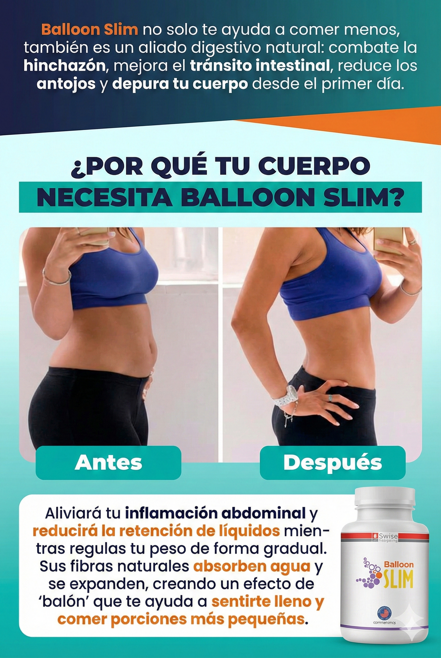 Balloon Slim es un suplemento en cápsulas con fibras naturales que al mezclarse con agua ayudan a: